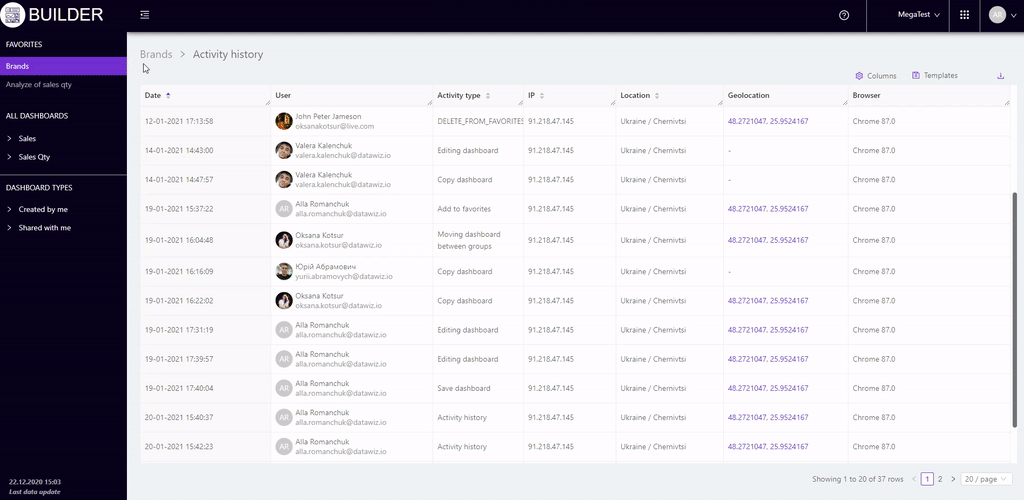 Share dashboardVisualization CreatingDashboard viewingBuilderActivity historyHome pageDashboard editingACTIVITY HISTORY