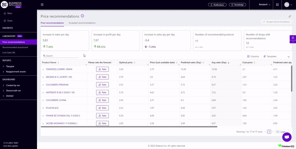 The "Price recommendations" tab allows to view a list of recommendations with predicted sales increases and accept the recommended optimal price for the product.