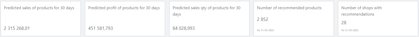 To generate recommendations, the algorithm analyzes the sales of each store for the last 30 days from the last date for which the data is uploaded into the service, and then clusters the stores (groups them).