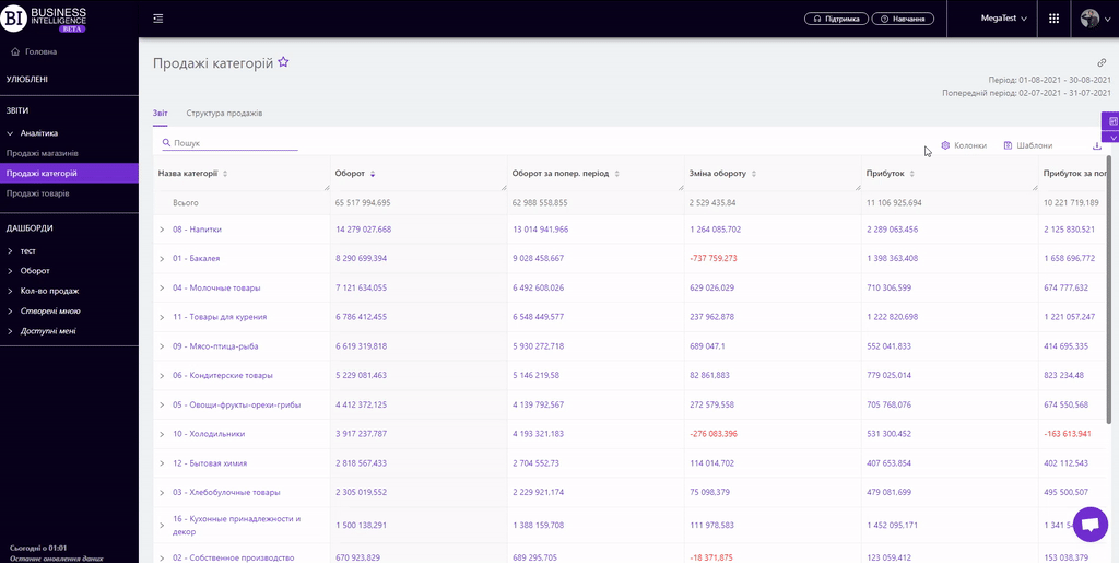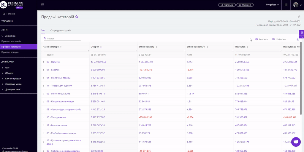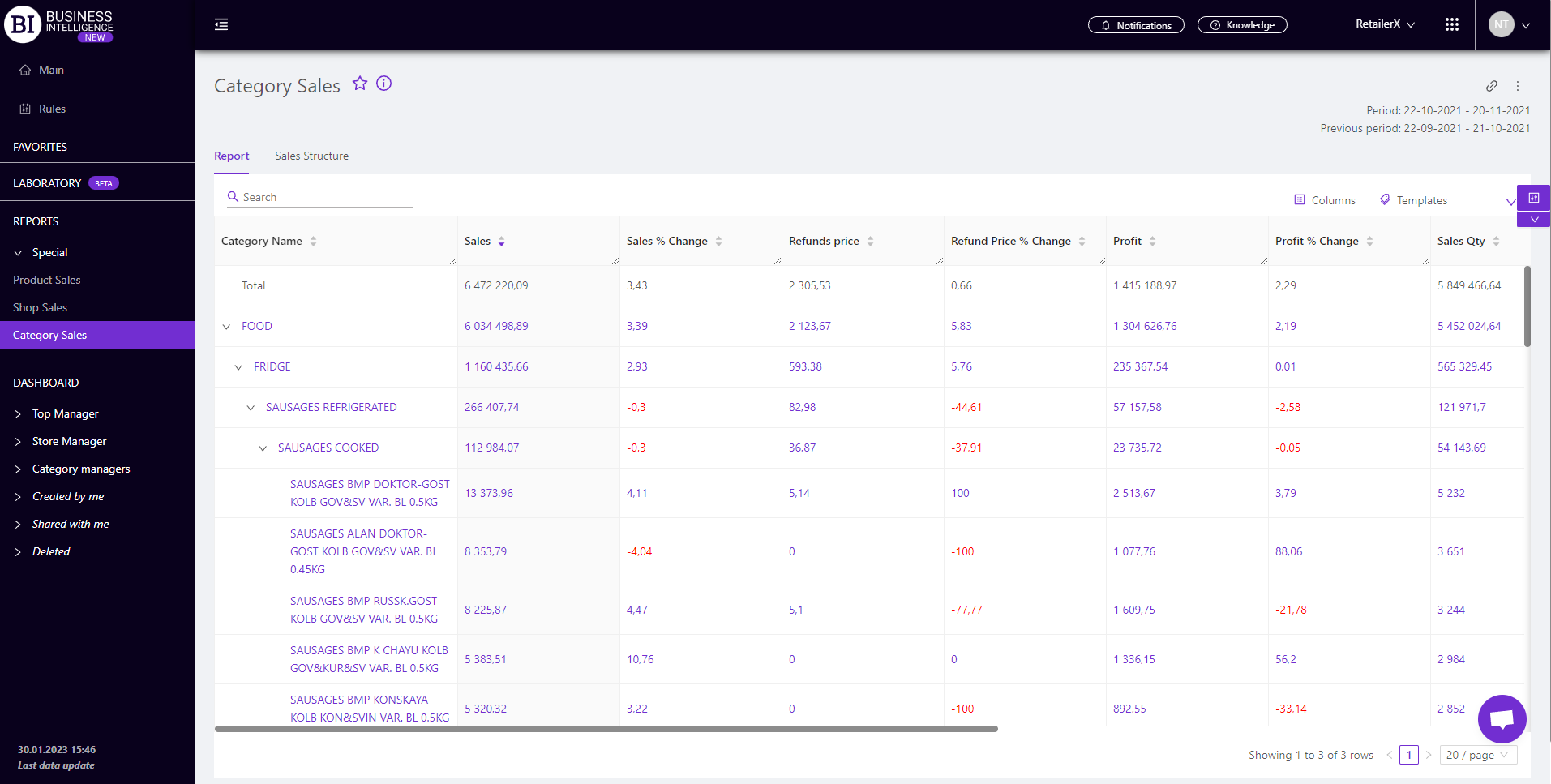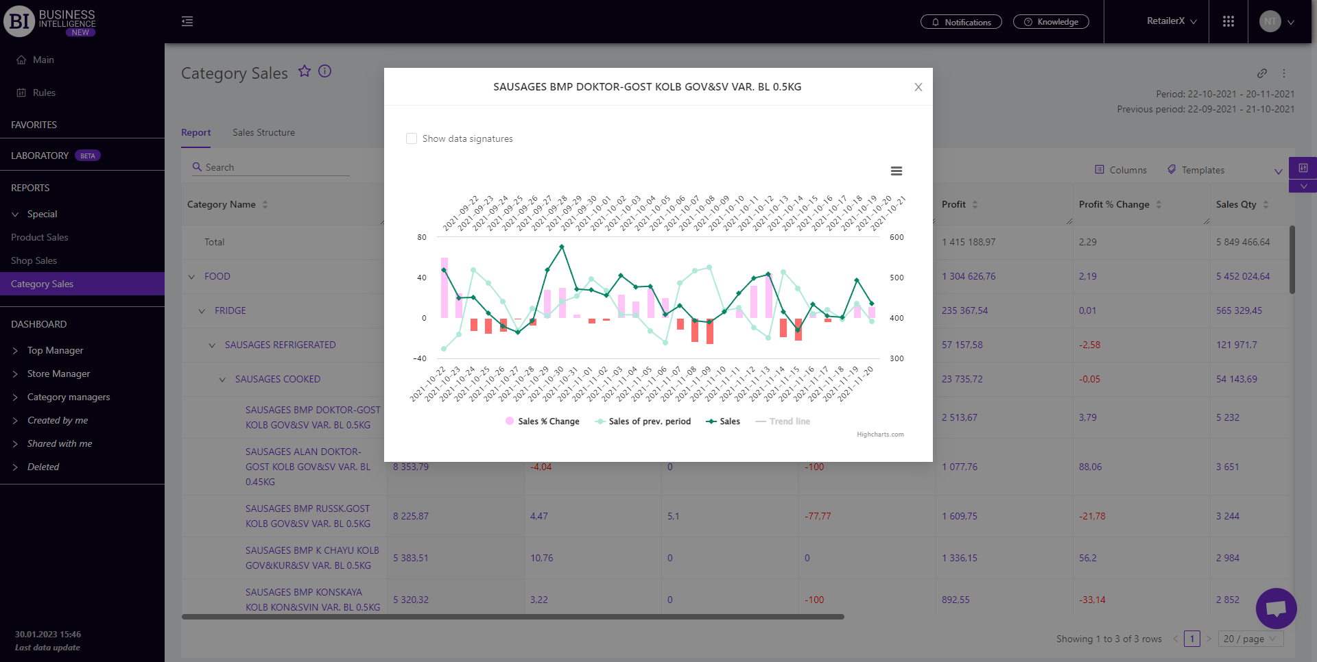 Brand salesStore cardProduct CardBasket AnalysisQuadrant analysisProducers analysisPlanogram EfficiencyLost SalesSales ChangeCategory managersSuppliers salesMarkers comparisonCategory CardProducts salesStores salesCategories salesStock MonitoringMainUnsaleable productsPrediction of OoS24-Hour AnalysisProducts movementEffectiveness of сashiersProducts for adjustmentPOS-terminal TrafficSales PlansPromotion AnalysisNew SKUEffectiveness of Loyalty ProgramPromo CardRFM - analysisStatistic of Loyalty ProgramCustomer Loyalty SegmentationLoyalty CardComparative DynamicsReceiptsCATEGORIES SALES