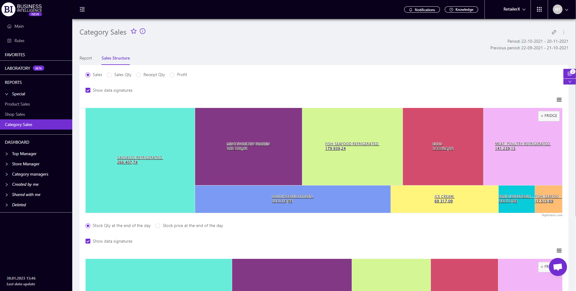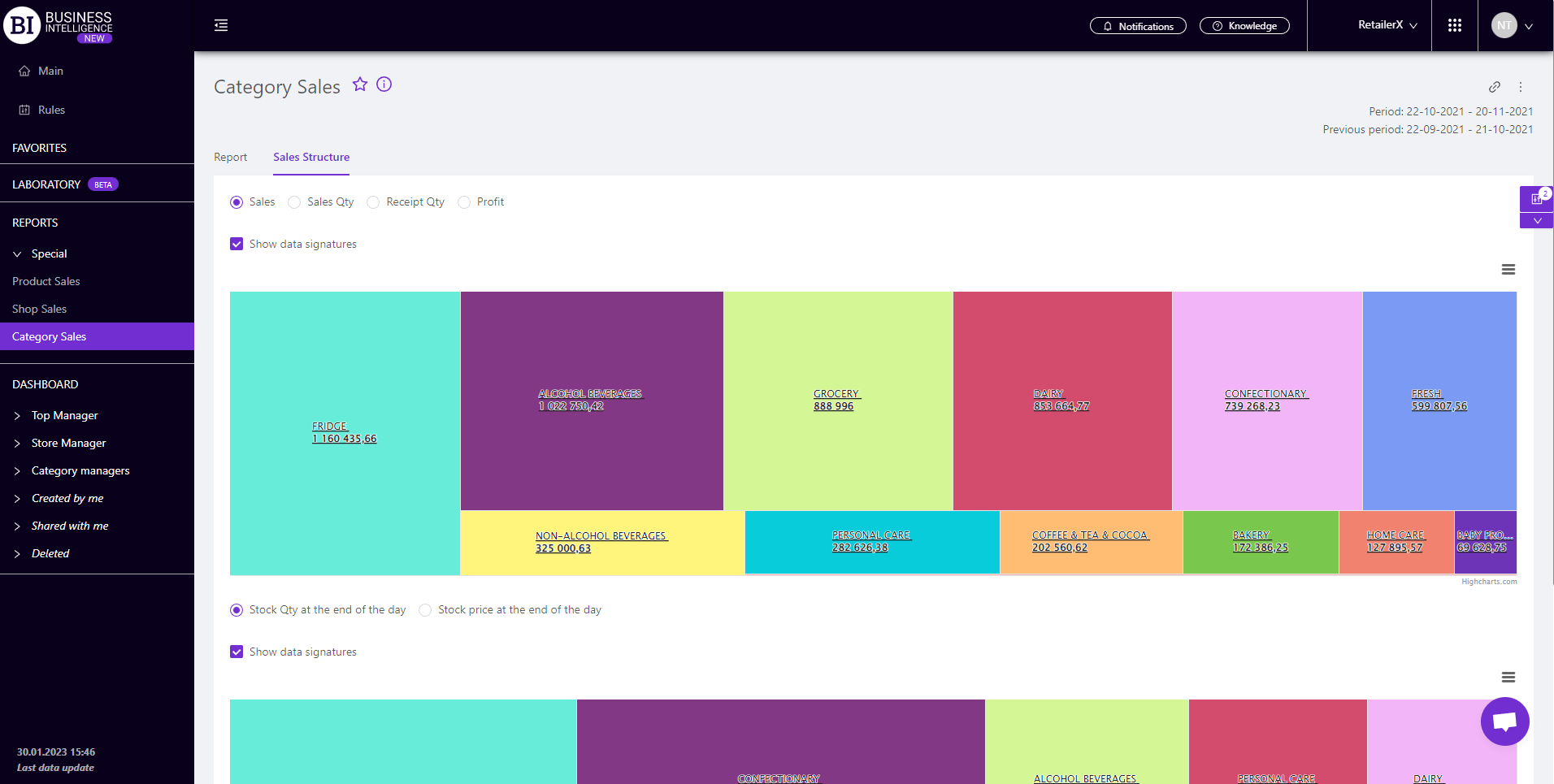 - upper visualization represents the structure of the category sales and is based on one of the metrics: Sales, Sales Qty, Receipt Qty, Profit.