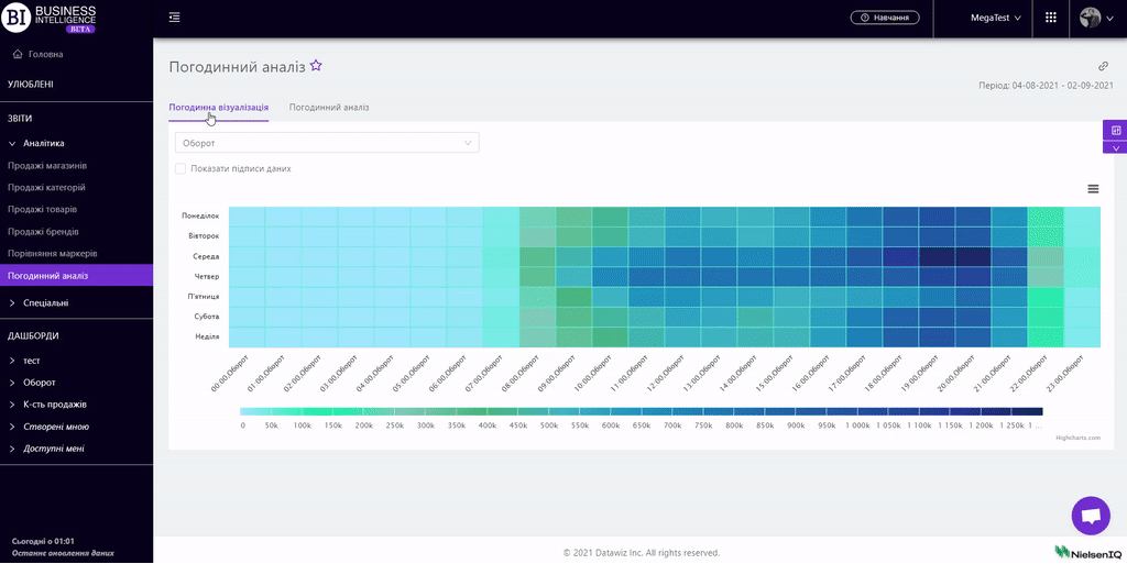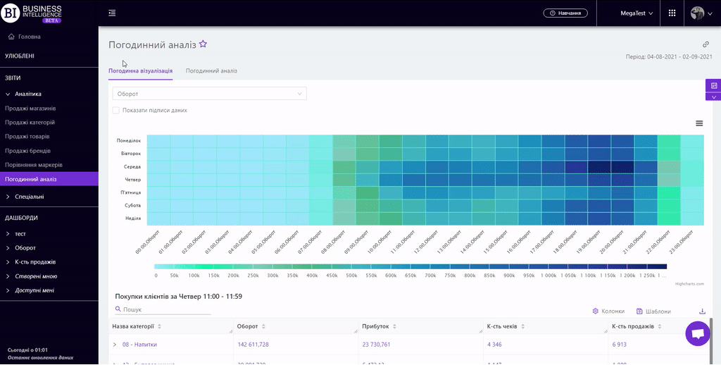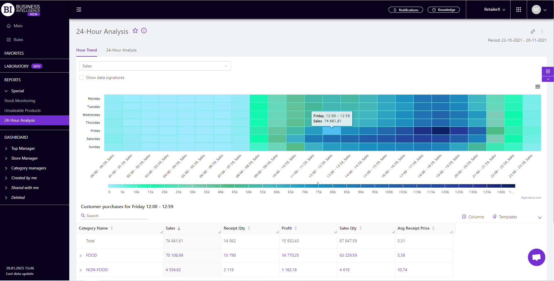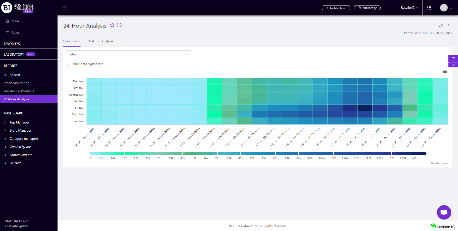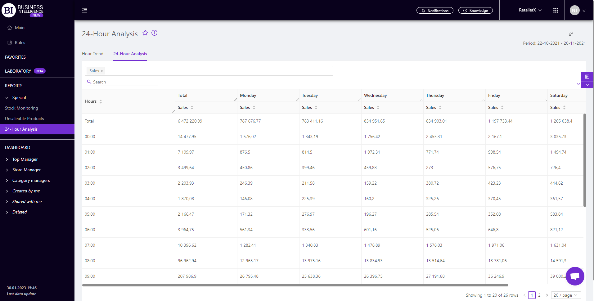 Brand salesStore cardProduct CardBasket AnalysisQuadrant analysisProducers analysisPlanogram EfficiencyLost SalesSales ChangeCategory managersSuppliers salesMarkers comparisonCategory CardProducts salesStores salesCategories salesStock MonitoringMainUnsaleable productsPrediction of OoS24-Hour AnalysisProducts movementEffectiveness of сashiersProducts for adjustmentPOS-terminal TrafficSales PlansPromotion AnalysisNew SKUEffectiveness of Loyalty ProgramPromo CardRFM - analysisStatistic of Loyalty ProgramCustomer Loyalty SegmentationLoyalty CardComparative DynamicsReceipts24-HOUR ANALYSIS