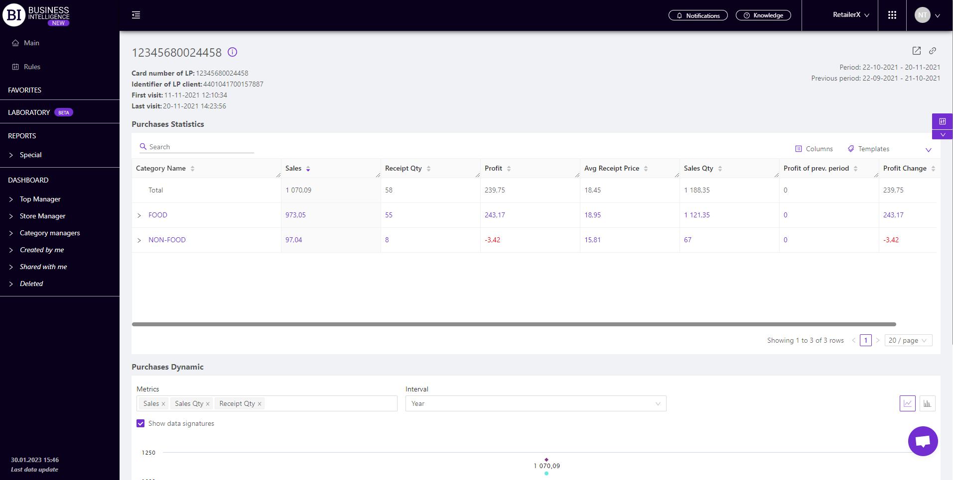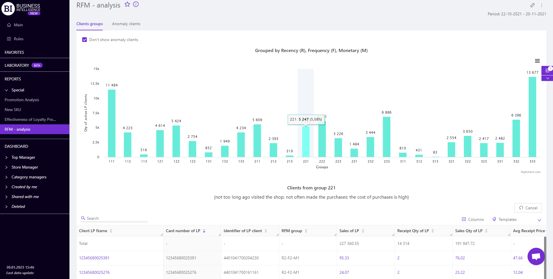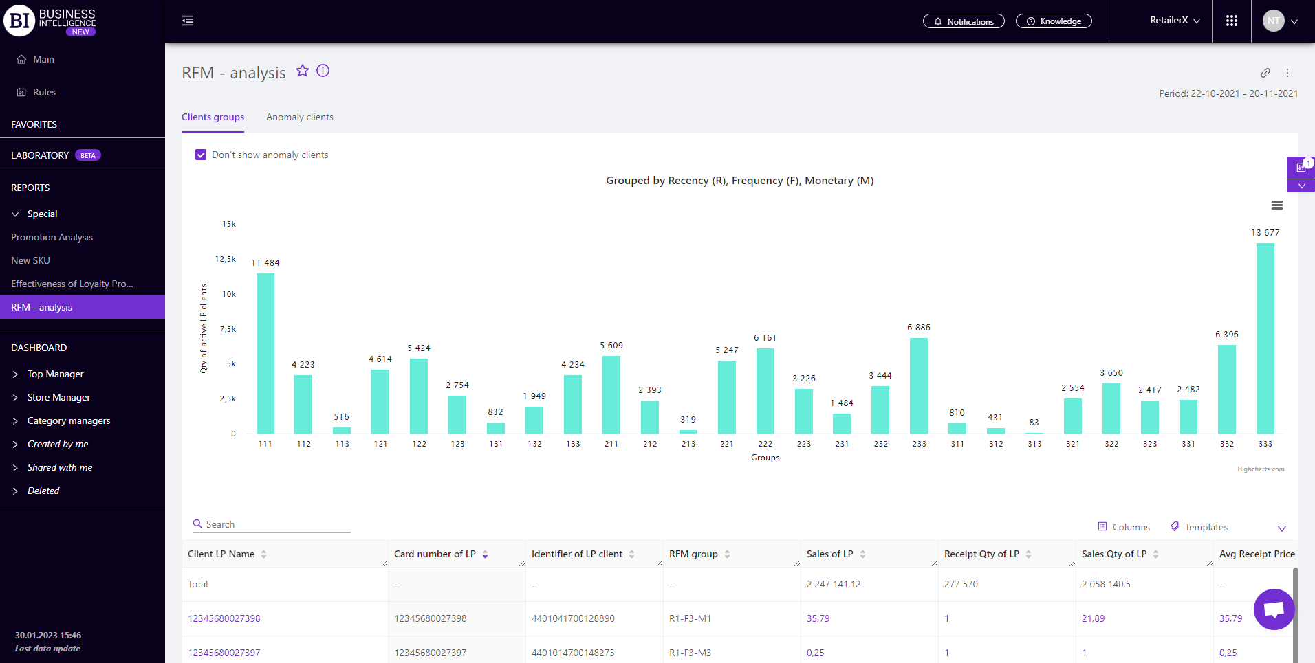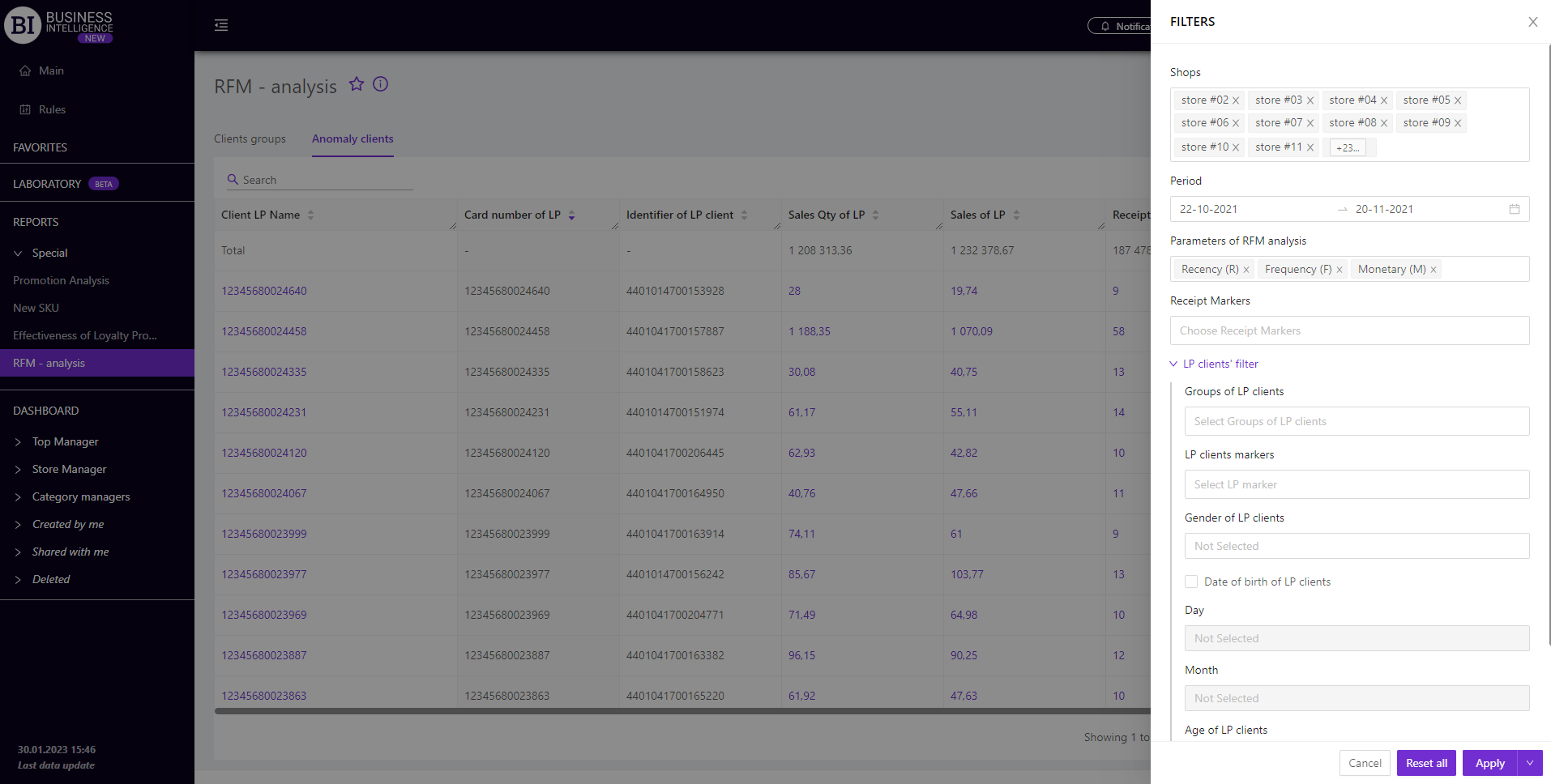 Brand salesStore cardProduct CardBasket AnalysisQuadrant analysisProducers analysisPlanogram EfficiencyLost SalesSales ChangeCategory managersSuppliers salesMarkers comparisonCategory CardProducts salesStores salesCategories salesStock MonitoringMainUnsaleable productsPrediction of OoS24-Hour AnalysisProducts movementEffectiveness of сashiersProducts for adjustmentPOS-terminal TrafficSales PlansPromotion AnalysisNew SKUEffectiveness of Loyalty ProgramPromo CardRFM - analysisStatistic of Loyalty ProgramCustomer Loyalty SegmentationLoyalty CardComparative DynamicsReceiptsRFM - ANALYSIS