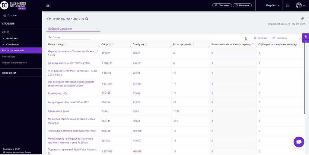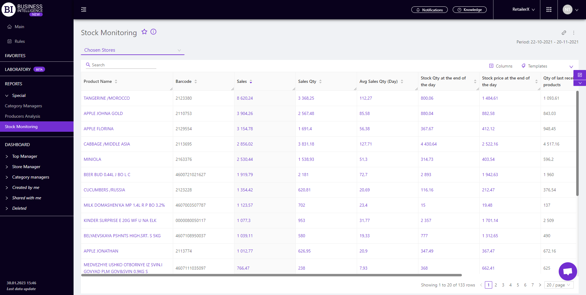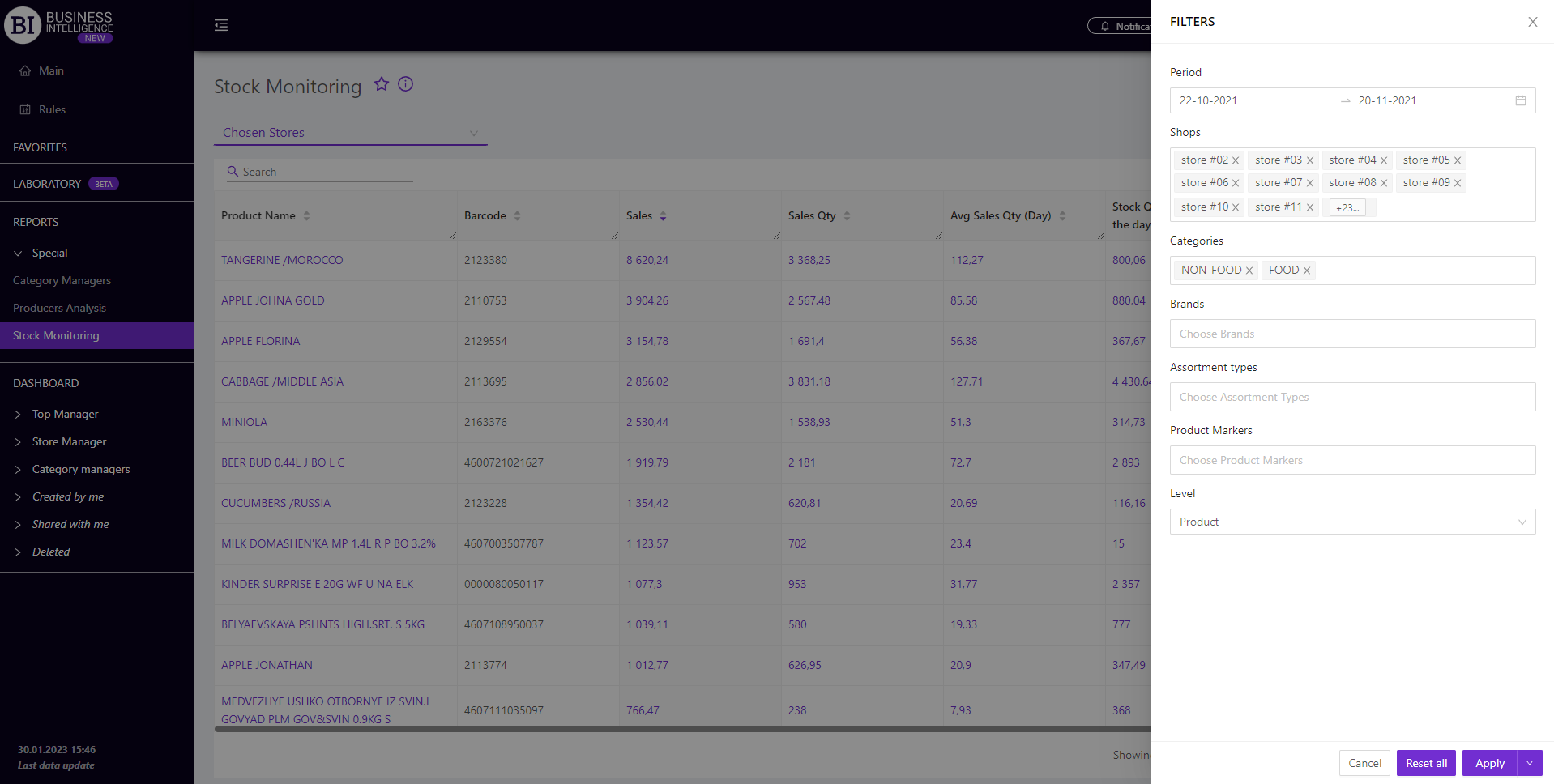Brand salesStore cardProduct CardBasket AnalysisQuadrant analysisProducers analysisPlanogram EfficiencyLost SalesSales ChangeCategory managersSuppliers salesMarkers comparisonCategory CardProducts salesStores salesCategories salesStock MonitoringMainUnsaleable productsPrediction of OoS24-Hour AnalysisProducts movementEffectiveness of сashiersProducts for adjustmentPOS-terminal TrafficSales PlansPromotion AnalysisNew SKUEffectiveness of Loyalty ProgramPromo CardRFM - analysisStatistic of Loyalty ProgramCustomer Loyalty SegmentationLoyalty CardComparative DynamicsReceiptsSTOCK MONITORING