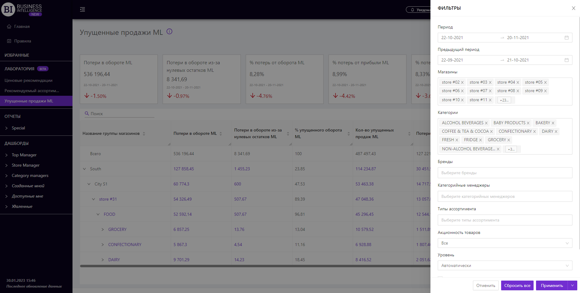 Упущенные продажи ML – с помощью алгоритмов машинного обучения отчет анализирует движение товаров, моделирует прогнозы продаж и обобщает данные о потерях в обороте из-за отсутствующих или низких продаж.