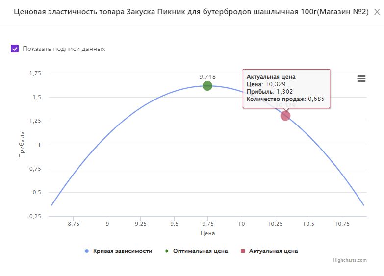 Показатель "Цена", выделенный фиолетовым цветом для низшего уровня, является кликабельным. Клик по нему открывает окно с графиком ценовой эластичности товара, который содержит: Кривую зависимости прибыли от цены товара, Актуальную цену и Оптимальную цену. Двигая мышкой по кривой, можно увидеть прогнозируемое значение прибыли и количества продаж при определенной цене.