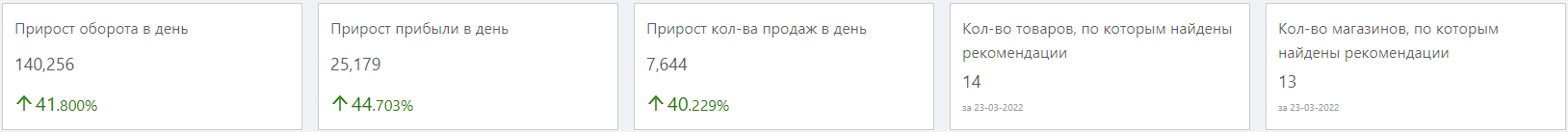 Наверху размещены информационные карточки, отображающие количество товаров и магазинов с рекомендациями и прогнозируемые изменения показателей продаж в день, а именно: