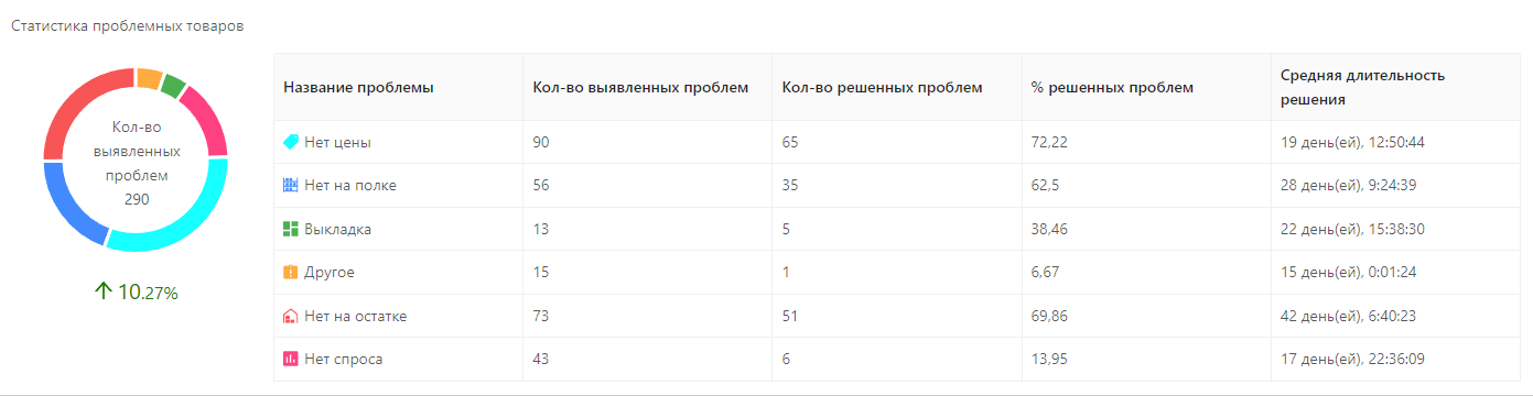 Блок "Статистика проблемных товаров" показывает информацию по всем проблемным товарам категории, статистику их возникновения и решения.