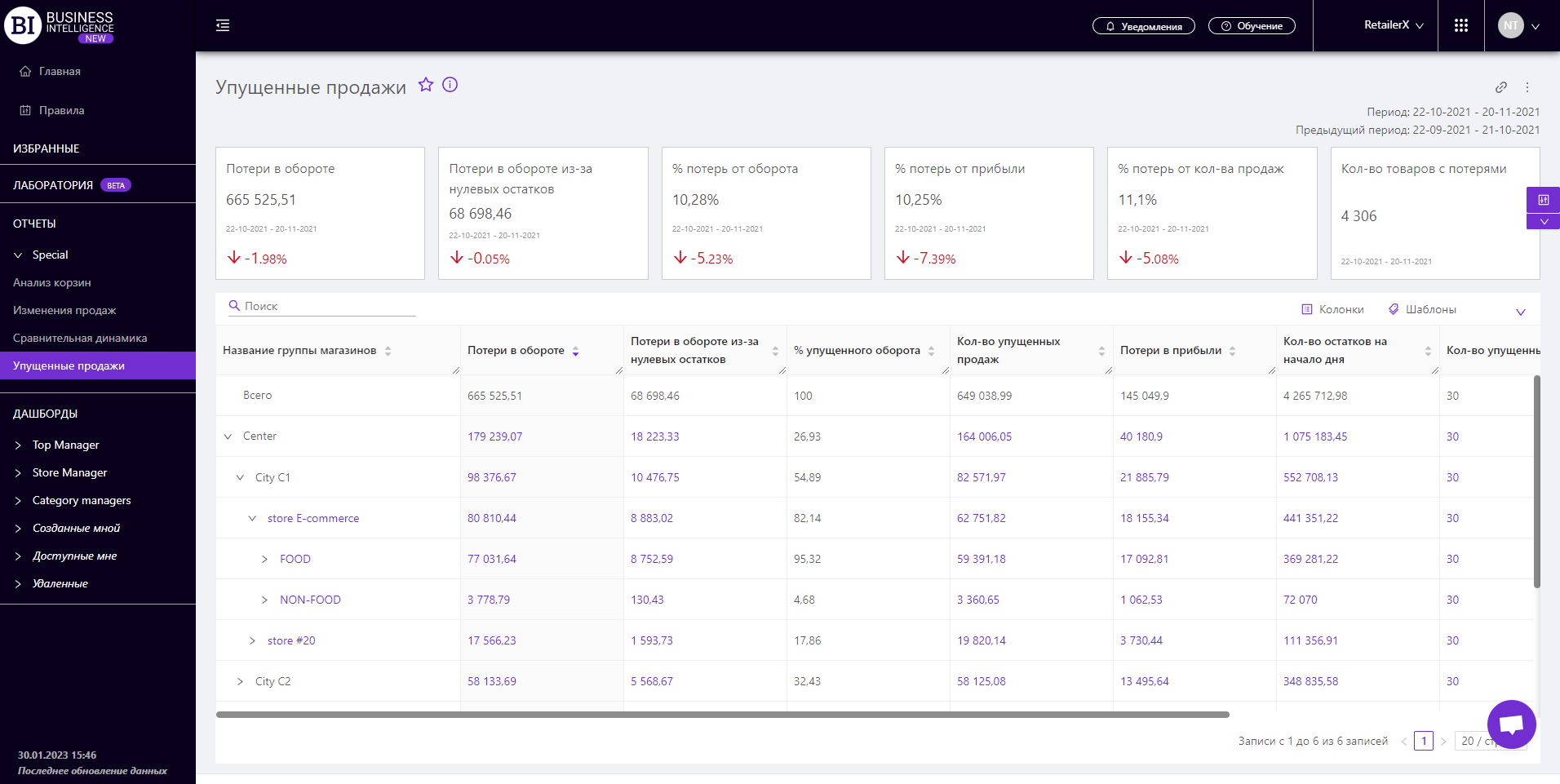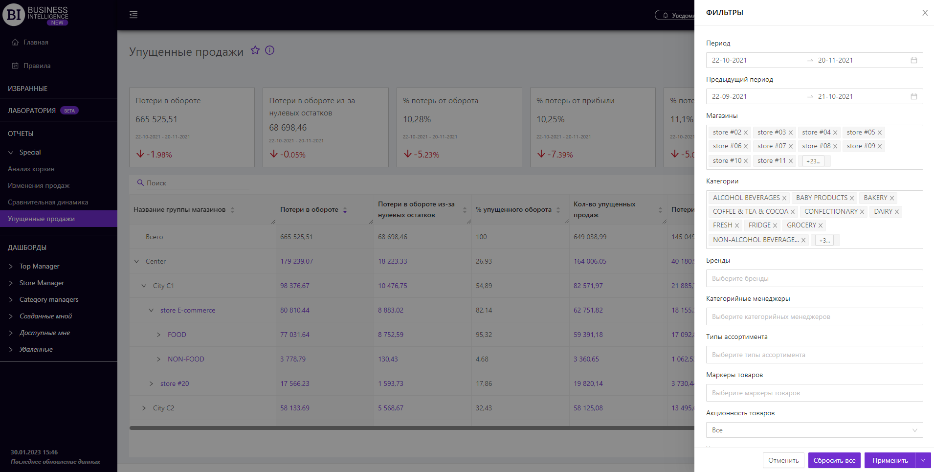 - выявлять упущенные продажи по товарам, категориям, магазинам, категорийным менеджерам;