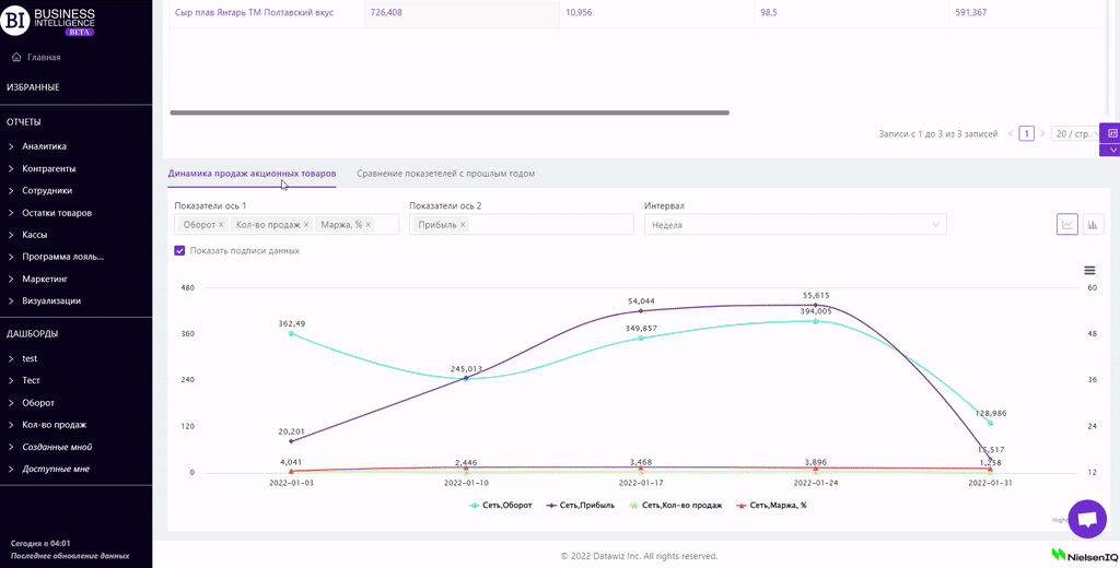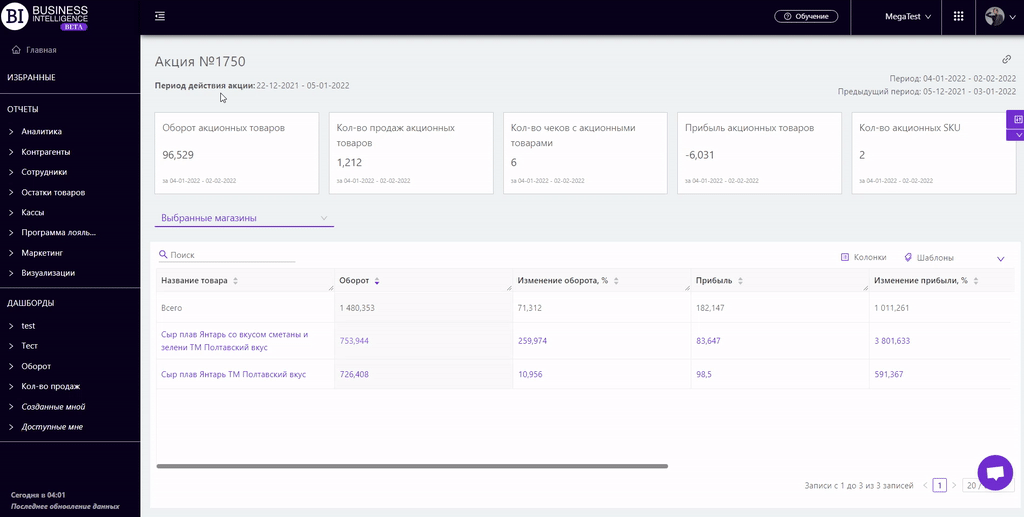 Продажи брендовКарточка магазинаКарточка товараАнализ корзинКвадрантный анализАнализ производителейЭффективность планограммУпущенные продажиИзменения продажКатегорийные менеджерыАнализ поставщиковСравнение маркеровКарточка категорииПродажи товаровПродажи магазиновПродажи категорийКонтроль остатковГлавнаяТовары на выводПрогноз OoSПочасовой анализДвижение товаровЭффективность кассировТовары для переучетаПроходимость кассПланы продажАнализ акцийВведенные SKUЭффективность программы лояльностиКарточка акцииRFM - анализСтатистика программы лояльностиСегменты клиентов программы лояльностиКарточка клиента ПЛСравнительная динамикаЧекиКАРТОЧКА АКЦИИ