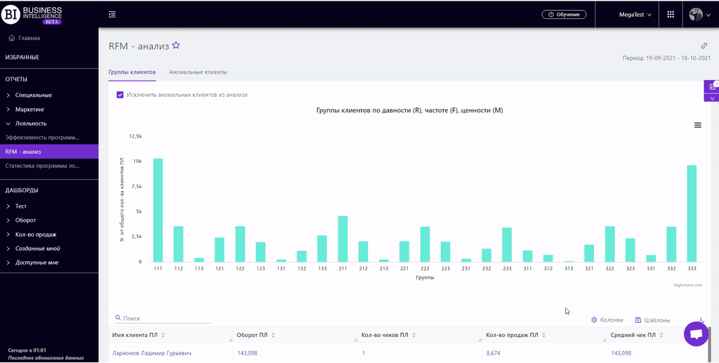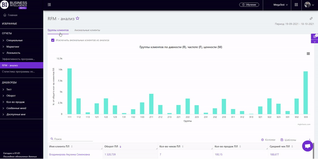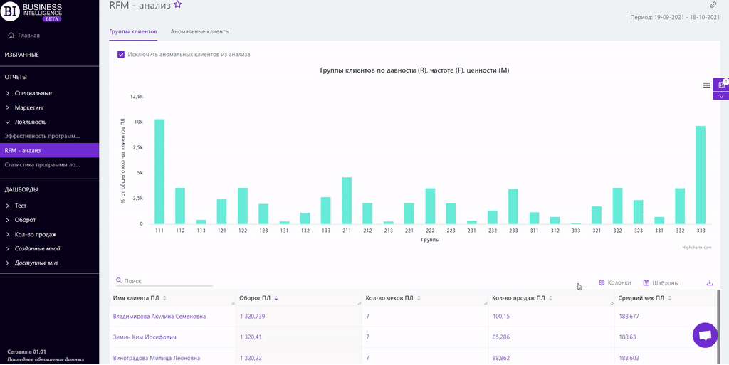 Отчет "RFM-анализ" позволяет распределить и проанализировать всех клиентов по параметрам: