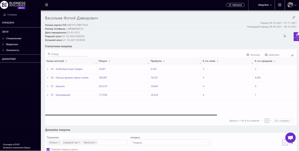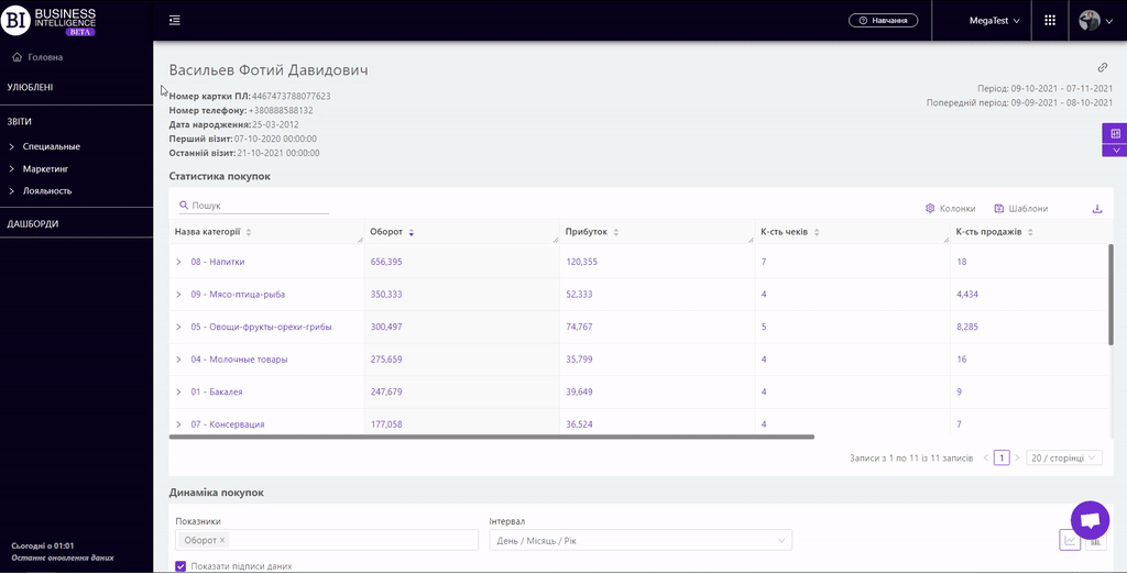 Продажі брендівКартка магазинуКартка товаруАналіз корзинКвадрантний аналізАналіз виробниківЕфективність планограмВтрачені продажіЗміни продажівКатегорійні менеджериАналіз постачальниківПорівняння маркерівКартка категоріїПродажі товарівПродажі магазинівПродажі категорійКонтроль залишківГоловнаТовари на виведенняПрогноз OoSПогодинний аналізРух товарівЕфективність касирівТовари для переоблікуПрохідність касПлани продажівАналіз акційВведені SKUЕфективність програми лояльностіКартка акціїRFM - аналізСтатистика програми лояльностіСегменти клієнтів ПЛКартка клієнта ПЛПорівняльна динамікаЧекиКАРТКА КЛІЄНТА ПЛ