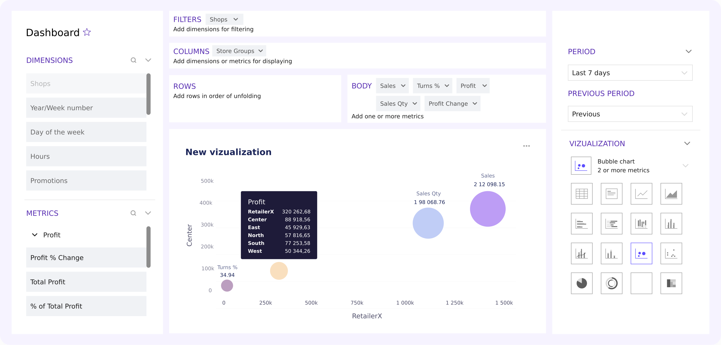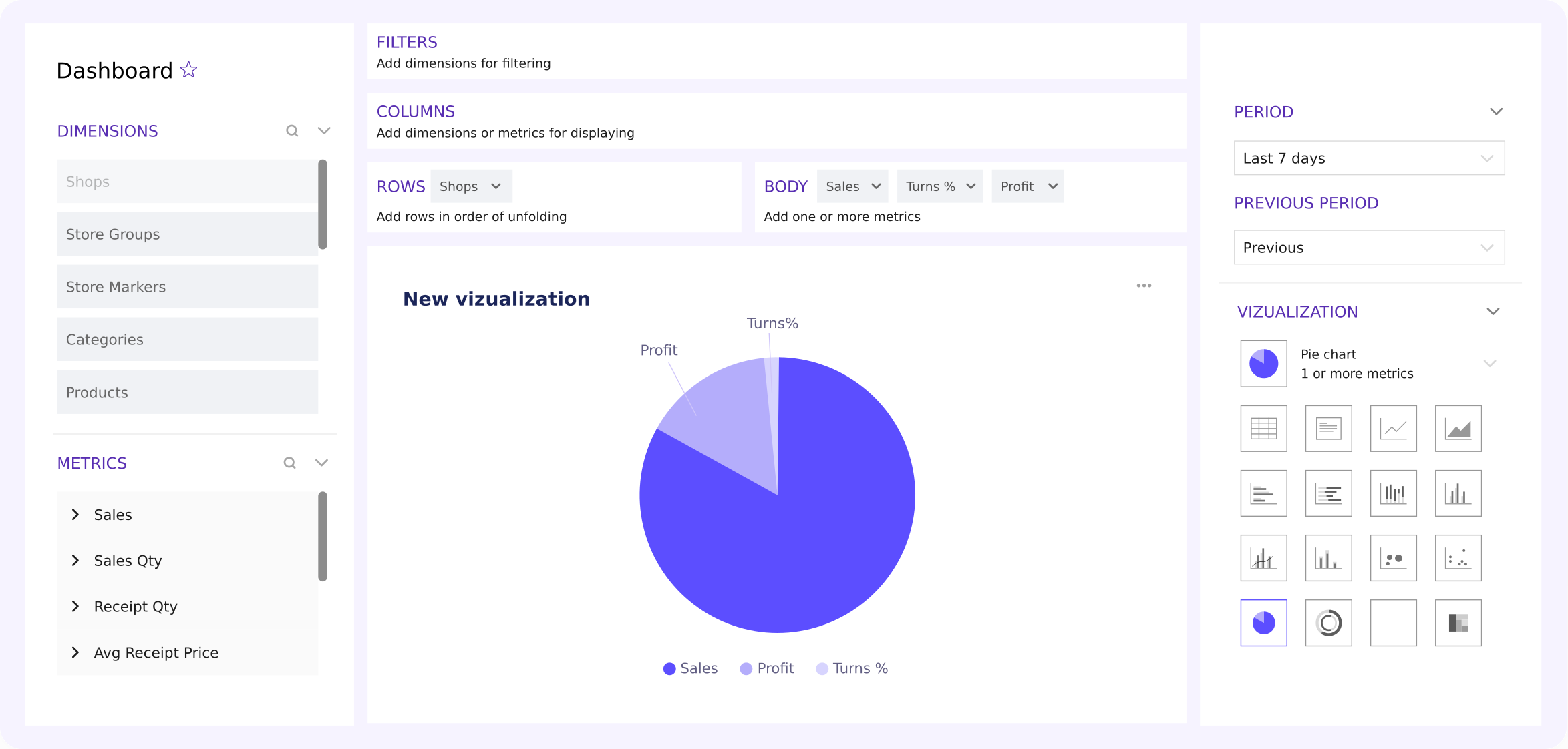 Конструктор дозволяє наочно представити потрібні дані, які відображають загальний стан мережі, закономірності чи неточності та допомагає у прийнятті рішень. Процес візуалізації даних в роздрібній торгівлі – це потужний BI інструмент для кожного ритейлера.